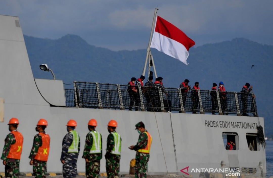 Sejumlah prajurit TNI AL berada di KRI Raden Eddy Martadinata -331 ketika KRI tersebut berlayar untuk melakukan pencarian KRI Nanggala-402 di Pelabuhan Tanjung Wangi, Banyuwangi, Jawa Timur, Minggu (25/4/2021). Pencarian KRI Nanggala-402 terkonsentrasi di sembilan titik perairan utara Bali, sekitar 40 Km dari pesisir Celukan Bawang, Kabupaten Buleleng, Bali. (Antara)