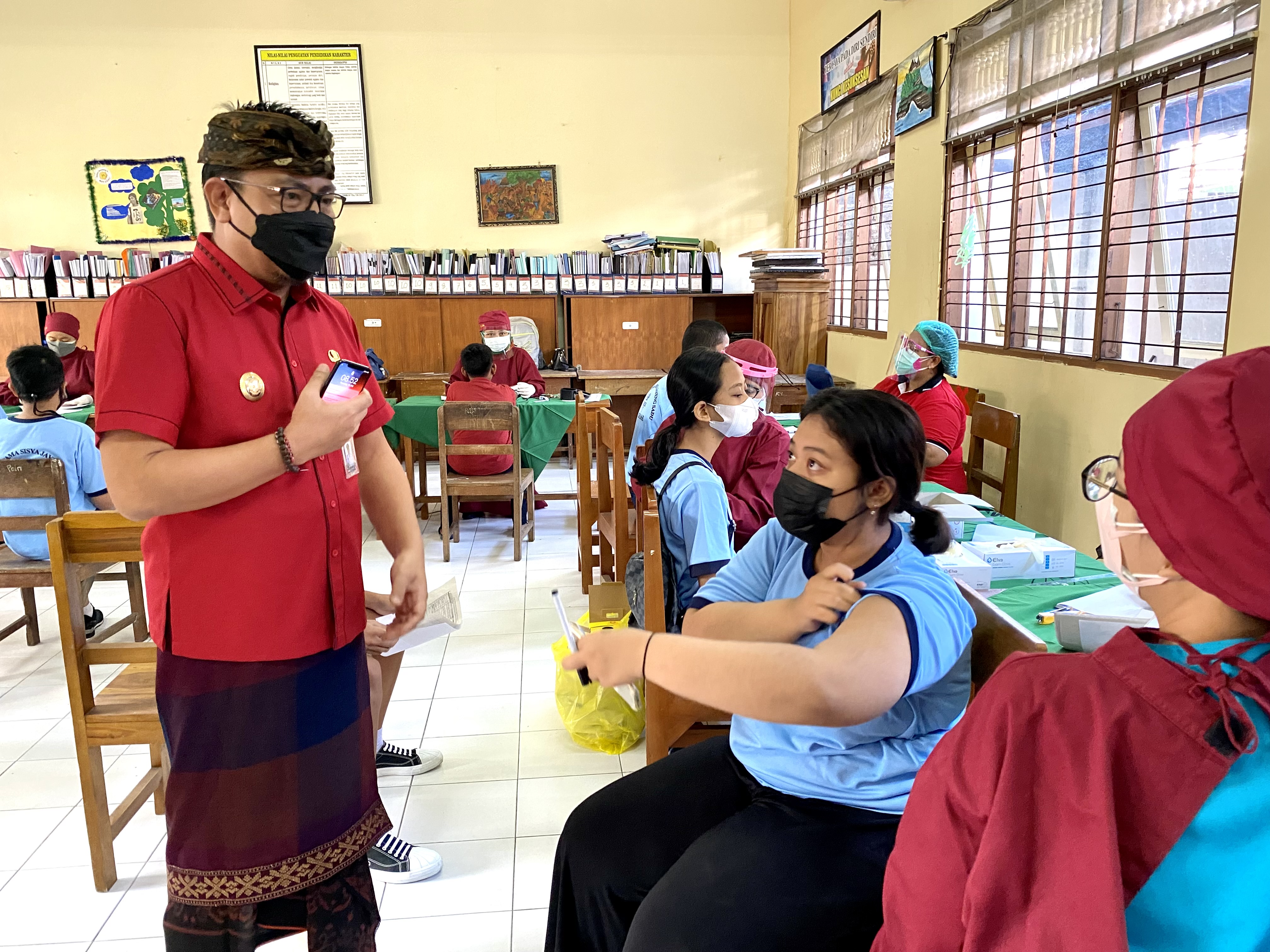 Guna memastikan percepatan Pelaksanaan vaksinasi Covid-19 bagi anak-anak usia 12-17 tahun, Wakil Walikota Denpasar, I Kadek Agus Arya Wibawa terus melaksanakan pemantauan secara langsung dan berkala, yang kali ini dilaksanakan di SMPN 7 Denpasar, Kamis (15/7).
