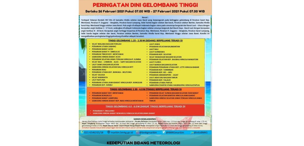 Badan Meteorologi, Klimatologi, dan Geofisika ( BMKG) merilis peringatan dini potensi gelombang tinggi untuk dua hari kedepan (26-27 Februari 2021) yang akan terjadi di sejumlah wilayah perairan Indonesia.