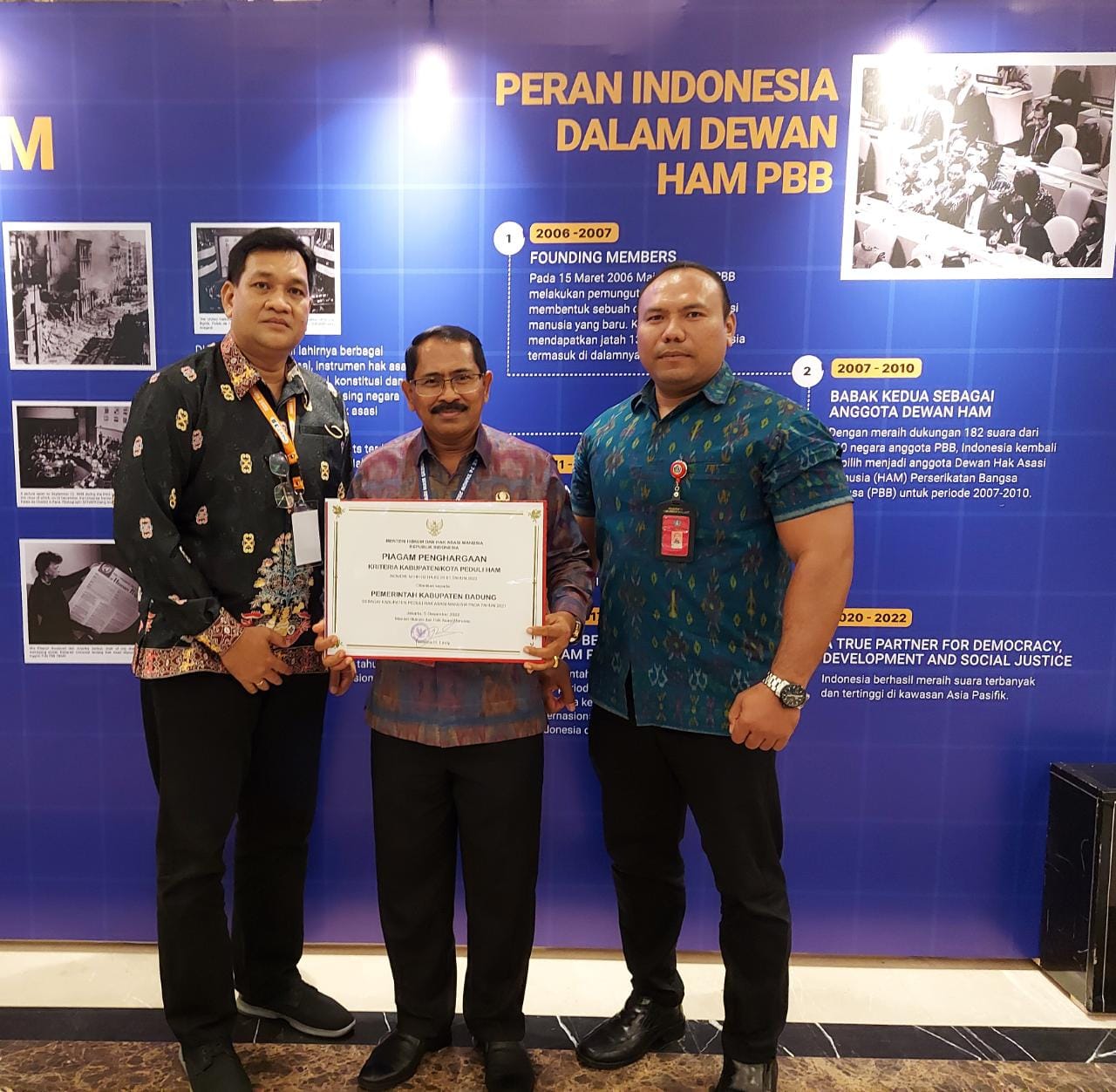 Penghargaan kepada Kabupaten Badung sebagai Kabupaten Peduli HAM diberikan secara simbolis oleh Menteri Hukum dan HAM RI dan diserahkan oleh Dirjen Hukum dan HAM, yang diterima langsung oleh Asisten Pemerintahan dan Kesra I Nyoman Sujendra mewakili Bupati Badung serta didampingi oleh Kabag Hukum AA. Gde Asteya Yudhya dan Pengelola Pelayanan Hukum pada Bagian Hukum Ketut Gede Mardika.