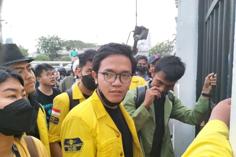 Perwakilan DPR RI dari bagian Hubungan Masyarakat menemui perwakilan mahasiswa terdiri ketua Badan Eksekutif Mahasiswa (BEM) UI Bayu Satria Utomo di pintu gerbang pejalan kaki yang ada di samping gerbang utama gedung DPR RI.
