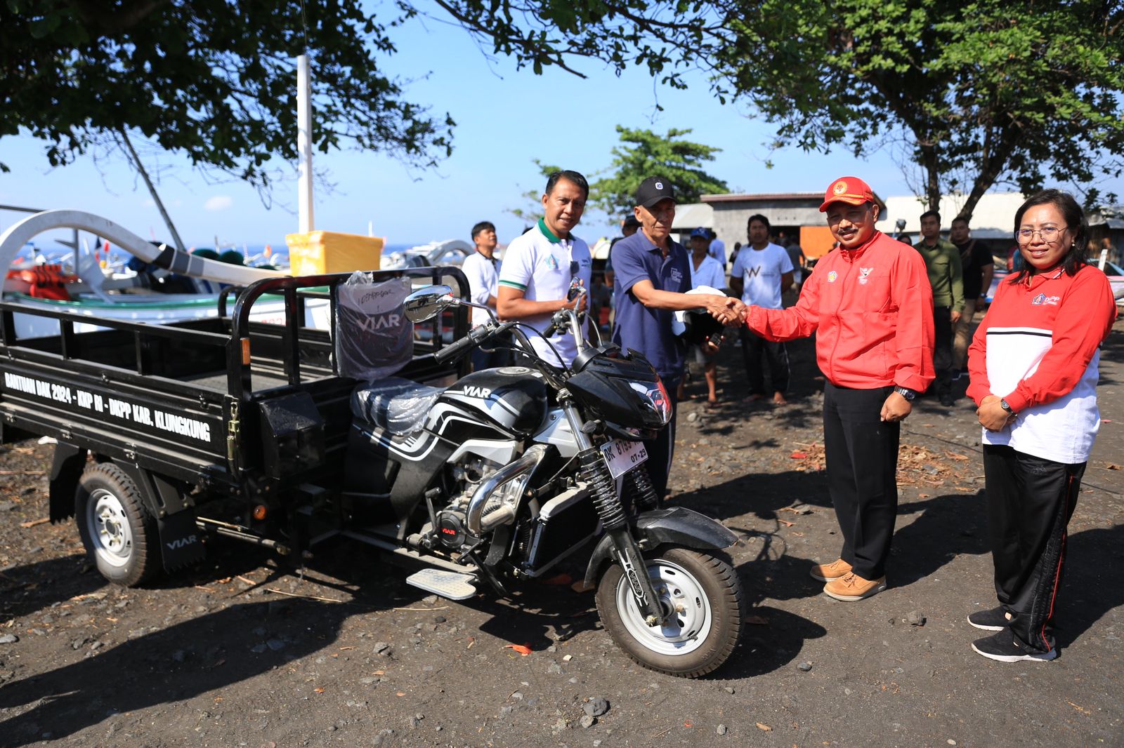 Penjabat Bupati Klungkung I Nyoman Jendrika didampingi Kepala Dinas Ketahanan Pangan dan Perikanan Klungkung Anak Agung Putra Wedana menyerahkan Bantuan Bidang Kelautan dan Perikanan dari dana DAK tahun 2024 di Kelompok Nelayan di Pantai Segara, Desa Kusamba, Kecamatan Dawan, Jumat (20/9).