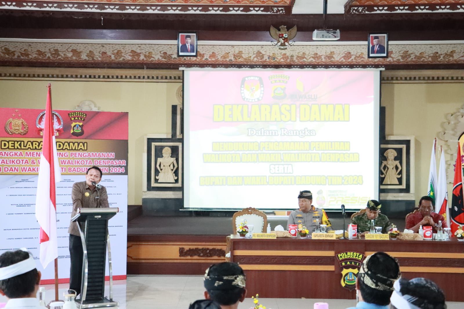 Dalam sambutannya, Pjs. Walikota Denpasar, I Dewa Gede Mahendra Putra menyampaikan, apresiasi atas pelaksanaan Deklarasi Damai Pemilihan Umum Kepala Daerah (Pilkada) Serentak Tahun 2024 yang diinisiasi Polresta Denpasar.