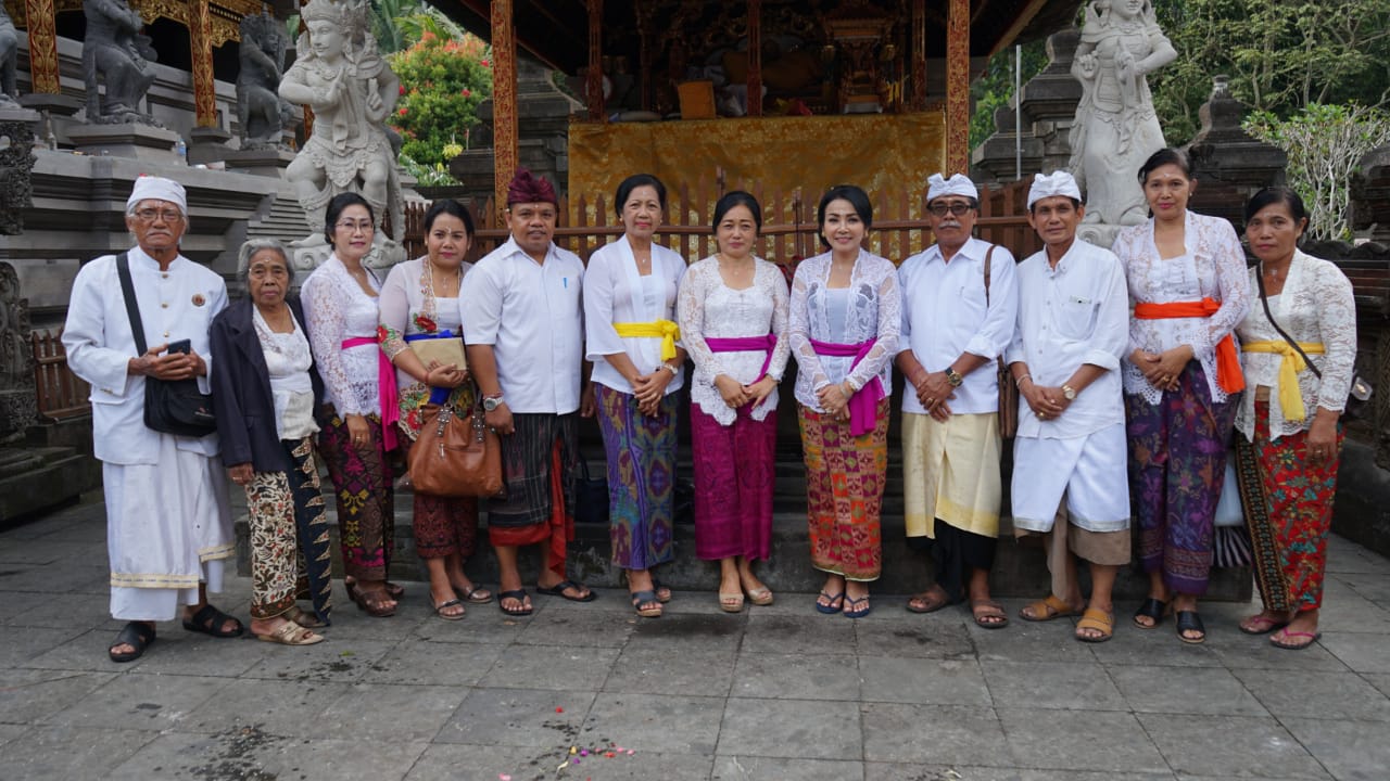 Ket foto : Ketua Tim Penggerak PKK Kota Denpasar Ny. Selly Dharmawijaya Mantra bersama Wakil Ketua Ny. Antari Jaya Negara dan Ny. Kerti Rai Iswara tirta yatra bersama lansia di Pura Tirta Empul dan Pura Pegulingan Tampak Siring Gianyar Senin (5/8).