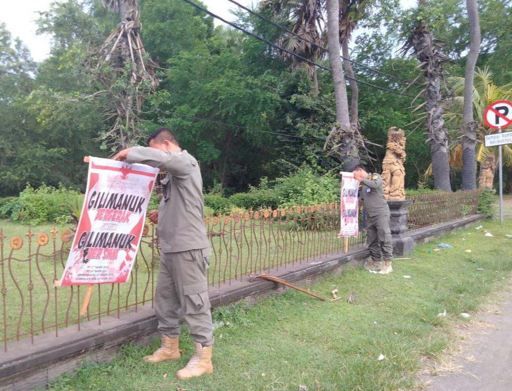 Sat Pol PP Kabupaten Jembrana menertibkan sejumlah baliho dan pamflet bertuliskan pengumuman “Gilimanuk Bergerak untuk Gilimanuk Ber-SHM”, Jumat (31/3/2023) sore.