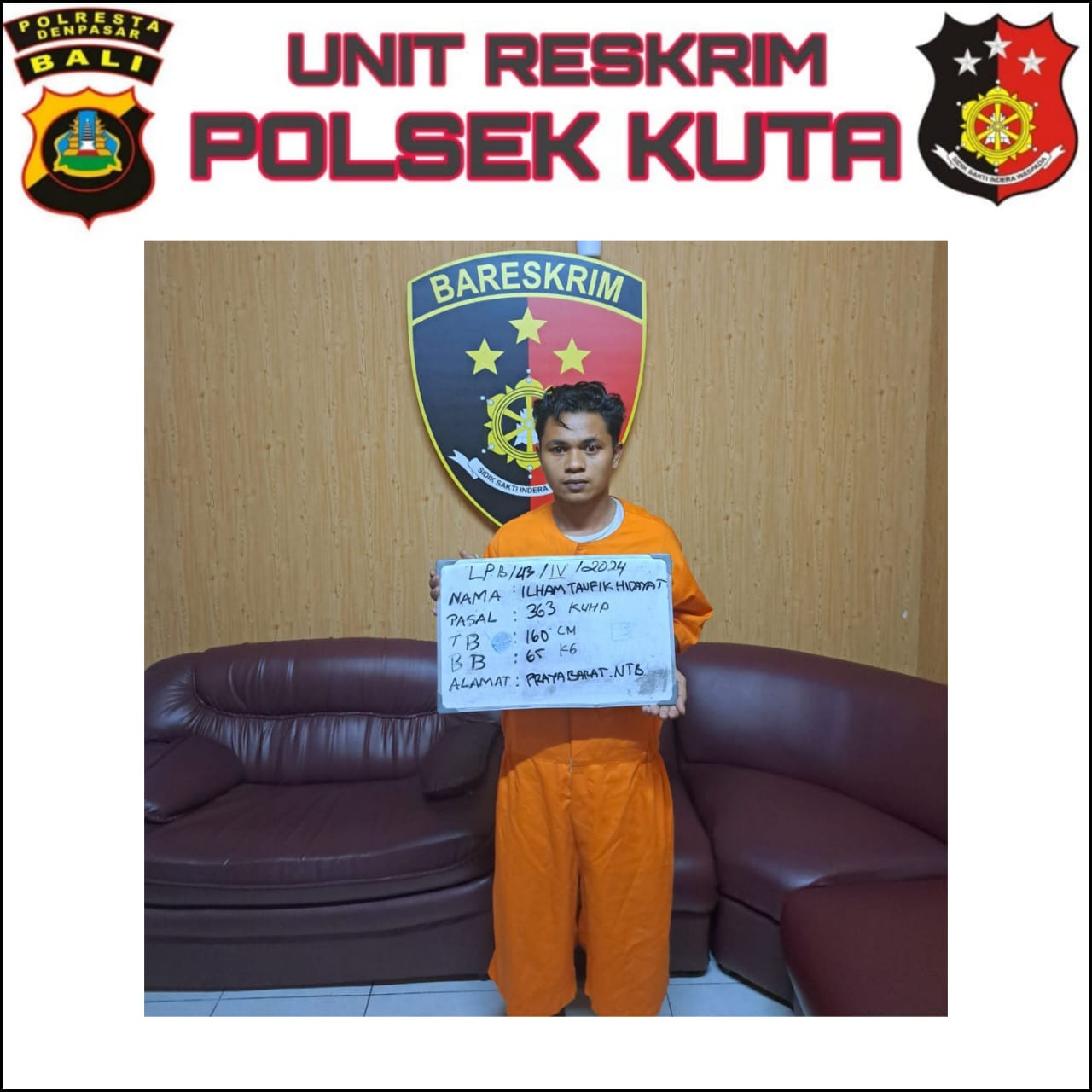 Seorang pria berinisial ITH (26 tahun) dari Kecamatan Praya Barat, NTB, telah diamankan oleh Polsek Kuta atas dugaan keterlibatannya dalam kasus pencurian kendaraan bermotor (curanmor). Kejadian ini terjadi pada Jumat, 29 Maret 2024, pukul 09.00 WITA, di sebuah rumah kos di Jalan Mataram Gang Suli, Kuta Badung.