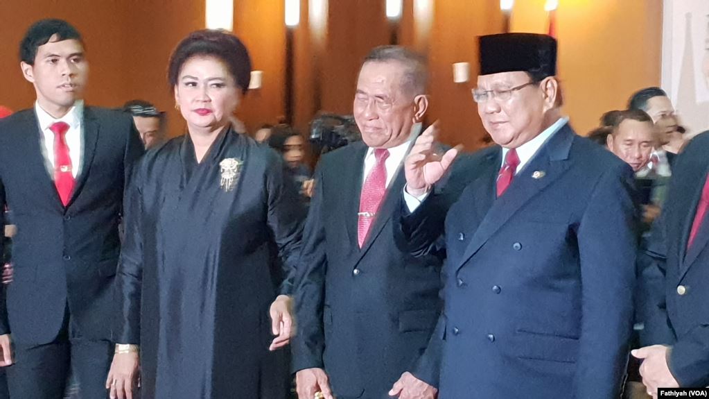 Letnan Jenderal (Purnawirawan) Prabowo Subianto (kanan) usai serah terima jabatan dari Jenderal Purnawirawan Ryamizard Ryacudu kepada di Kementerian Pertahanan, Kamis, (24/10). (Foto: VOA/Fathiyah)