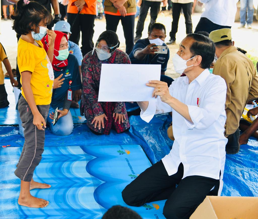 Hal itu terlihat saat anak-anak di lokasi pengungsian yang begitu riang saat Kepala Negara bergabung sejenak di tengah aktivitas mereka yang tampak sedang mewarnai, menggambar, atau membaca. Presiden sendiri begitu terhibur mendengar celoteh dan cerita anak-anak di sana.