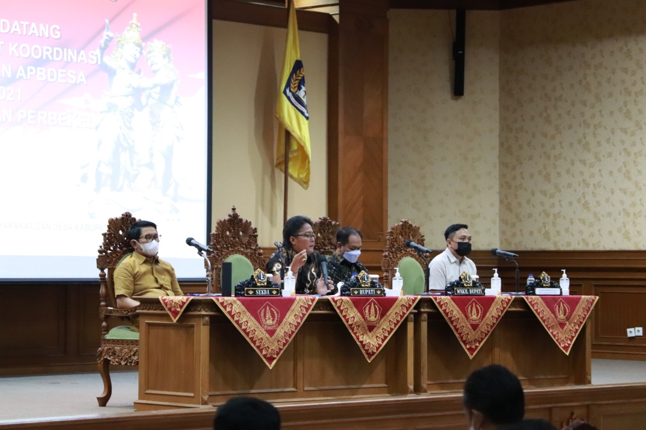 Bupati Giri Prasta dalam direktifnya menyampaikan pengelolaan dana desa pada tahun 2021 agar difokuskan pada 2 prioritas. Pertama adalah pemulihan ekonomi dimana dana desa agar digunakan untuk membentuk, mengembangkan, dan merevitalisasi Badan Usaha Milik Desa (Bumdes). Serta fokus kedua, melaksanakan pendataan desa, pemetaan potensi dan sumber daya, maupun pengembangan teknologi informasi dan komunikasi. “Kami Pemerintah Kabupaten Badung tidak mau hanya menerbitkan himbauan dan aturan saja kepada masyarakat. Tapi kami berupaya memberikan solusi untuk mengatasi kondisi ini. Untuk itulah hari ini kami mengundang seluruh perbekel dan sekdes di Badung, untuk menyamakan interpretasi mencari solusi bersama,” ujarnya.