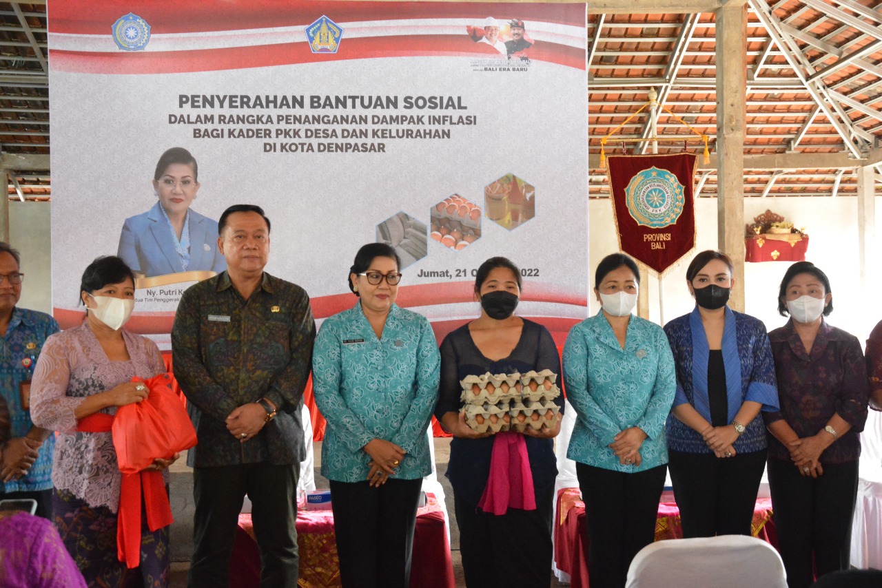 Melalui aksi kegiatan Penyerahan Bantuan Sosial dalam rangka “Penanganan Dampak Inflasi” sebanyak 645 orang kader TP PKK Desa /Kelurahan Se-Kota Denpasar yang terdampak inflasi, menerima paket bantuan yang diserahkan Ketua TP PKK Provinsi Bali, Ny. Putri Suastini Koster, pada Jumat (21/10). Saat momen penyerahan bantuan di empat lokasi itu, hadir Ketua TP PKK Kota Denpasar, Ny. Sagung Antari Jaya Negara.