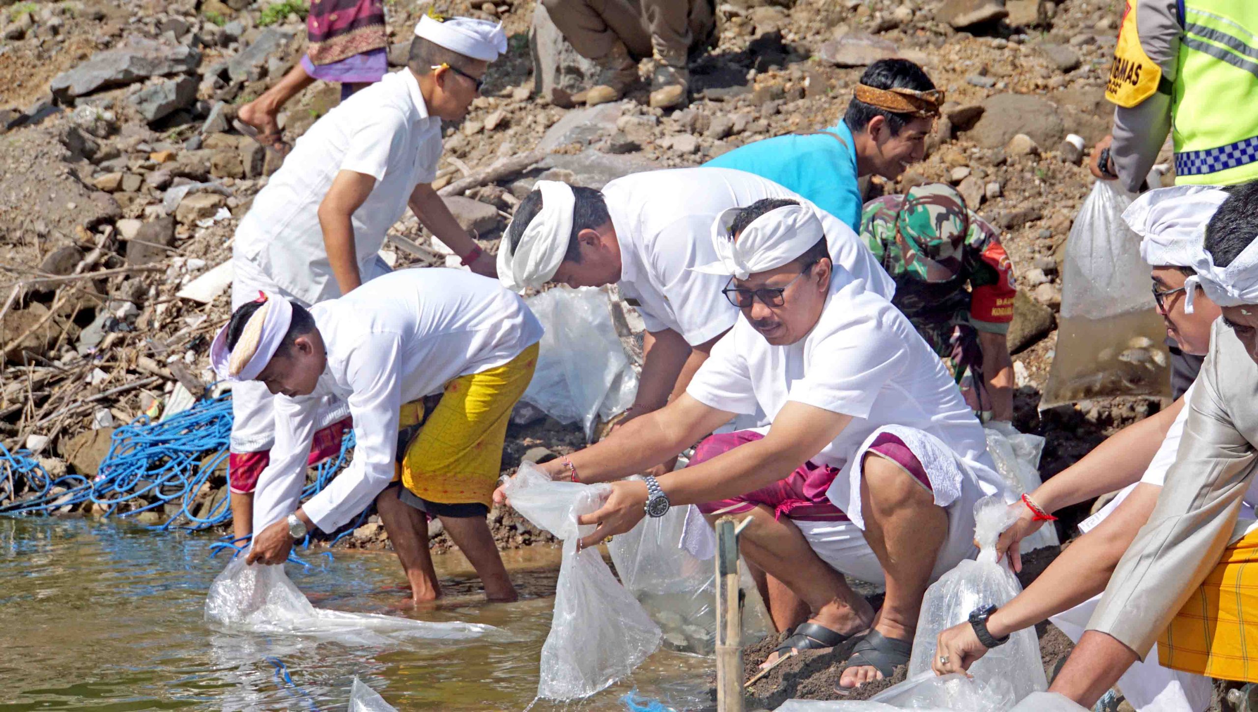 Penebaran benih ikan nila dilakukan usai persembahyangan bersama di Pura Subak kawasan Bendungan Danu Kerthi, Sabtu (25/3). Ditemani Kepala Dinas Ketahanan Pangan dan Perikanan serta Camat Sawan, sebanyak dua puluh ribu benih ikan nila dilepaskan.