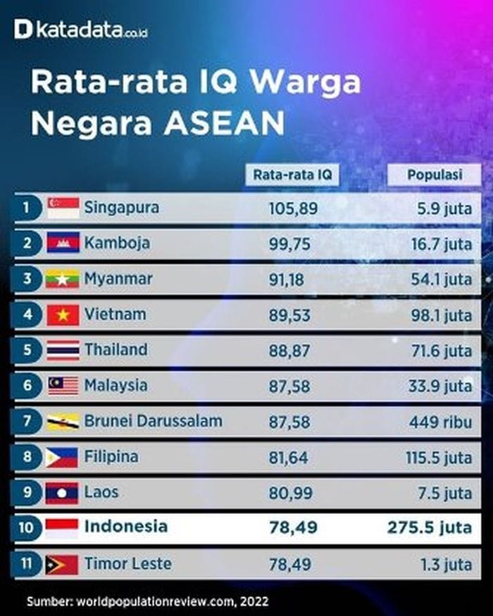 IQ, “Jongkok”, berdasarkan World Population Review (2024) , IQ rata-rata orang Indinesia 78,49, lebih rendah dari Malaysia 86,58 dan Thailand 88,87.