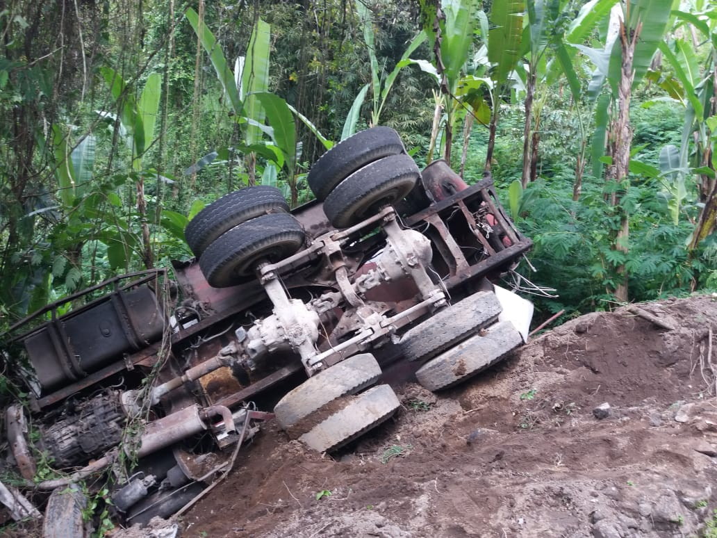 Kemudian saat itu, rem truck tidak berfungsi dengan baik. Kendaraan truck pun lepas kendali bergerak lurus ke arah utara dan akhirnya menabrak tebing yang berda di sebelah utara jalan dan kemudian terguling dengan posisi miring ke kanan.