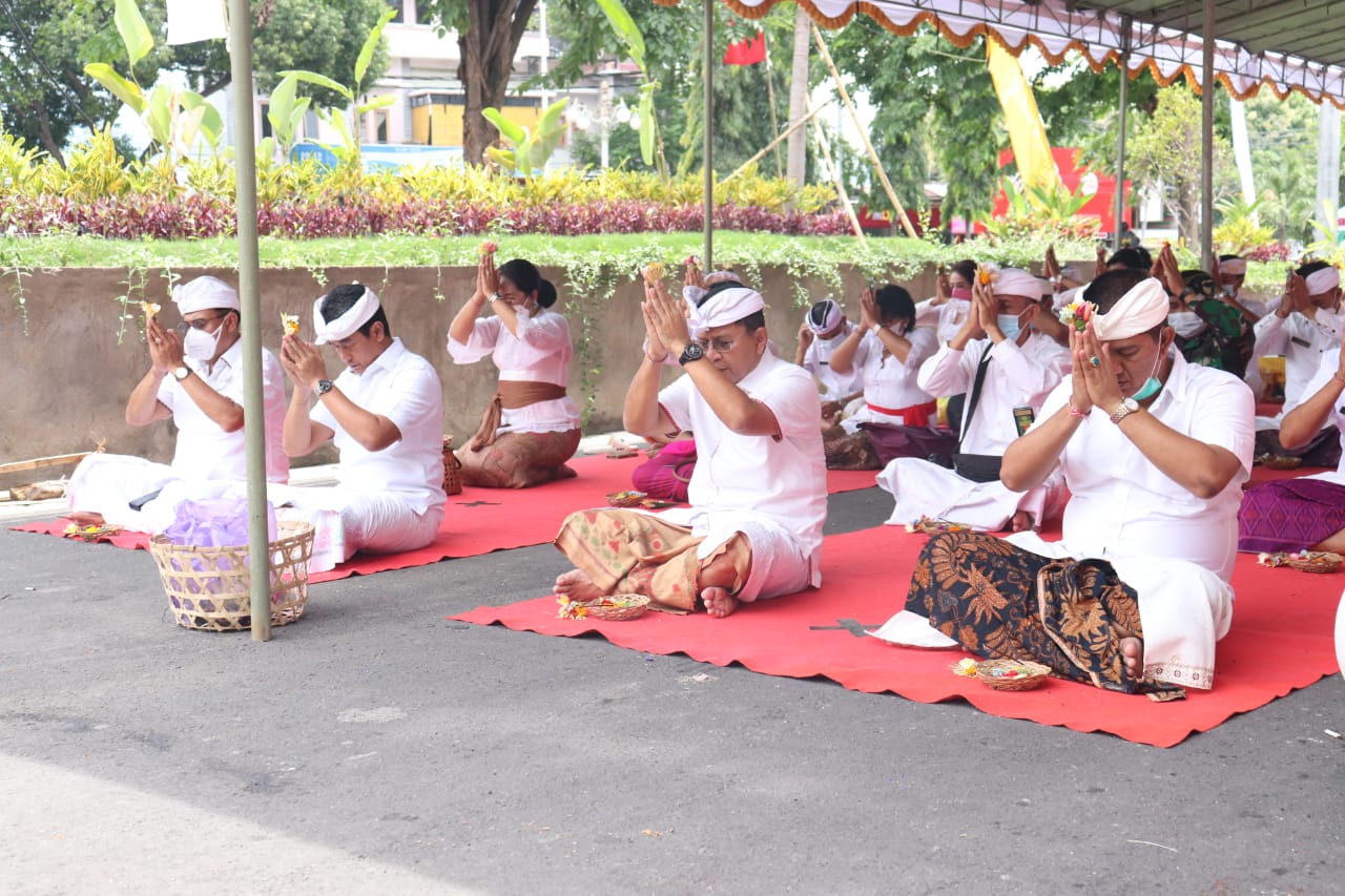 Bupati Buleleng Putu Agus Suradnyana,ST melakukan persembahyangan bersama pada upacara Karya Tawur Balik Sumpah Agung melaspas wewangunan pasar, melaspas pelinggih dan ngenteg linggih Ratu Ayu Melanting di Pasar Banyuasri, Singaraja, Kelurahan Banyuari, Kecamatan/Kabupaten Buleleng, Bali pada Kamis, (28/1/2021).