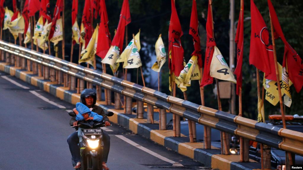 Seorang pria mengendarai sepeda motor melewati jembatan layang yang dihiasi bendera-bendera partai politik menjelang pemilu, Jakarta, 6 April 2019. (Foto: Reuters)