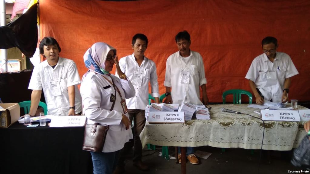 Almarhum Rudi Mulia Prabowo (kedua dari kanan) saat bertugas di TPS 009 Kelurahan Pisangan Baru. (Foto: dokumentasi keluarga).