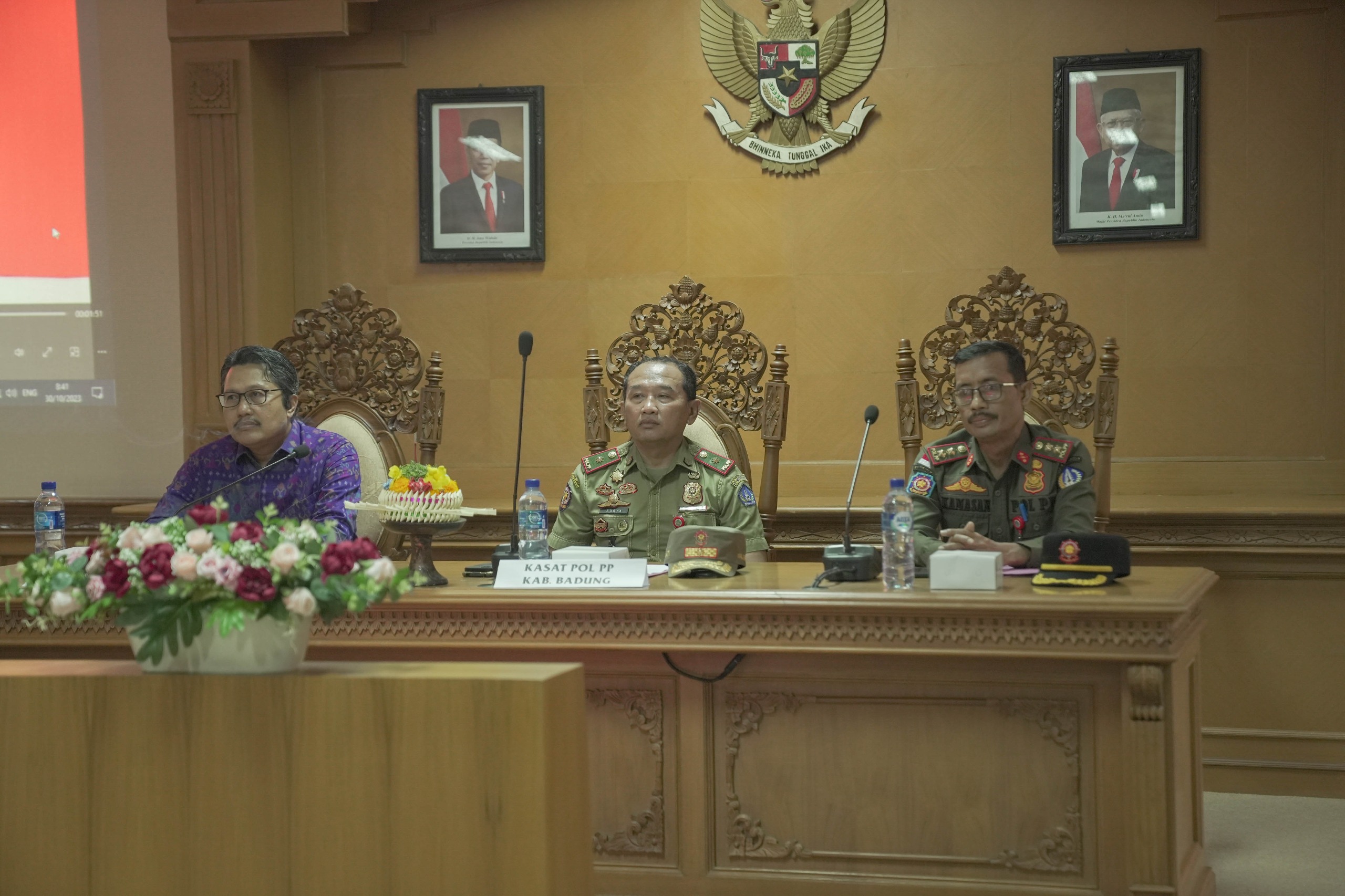 Satuan Polisi Pamong Praja (Satpol PP) Kabupaten Badung menggelar kegiatan peningkatan kapasitas SDM satuan Polisi Pamong Praja dan Satuan Perlindungan Masyarakat di Kabupaten Badung. Pelatihan ini diawali dengan pembukaan yang bertempat di Ruanng Rapat Inspektorat Kabupaten Badung, Senin (30/10). Kegiatan tersebut dibuka Kasatpol PP Badung I Gusti Agung Ketut Suryanegara, serta dihadiri Kapolres Badung diwakili Kasat Sampta, AKP. Gede Budiarta, Kodim 16 11 Badung diwakili PLH Pasiter Kodim 16 11, Kapten Infanteri I Wayan Sura, Kepala BKPSDM Prov. Bali diwakili Dr. I Made Sedana Yoga Widyaiswara, Kepala BKPSDM Kabupaten Badung diwakili Sekretaris Drs. A.A. Ngr. Bagus Wirayasa, MM., Kabid Perlindungan Masyarakat Satuan Polisi Pamong Praja Badung, I Wayan Kamsan serta peserta pelatihan peningkatan kapasitas sdm satuan polisi pamong praja dan satuan perlindungan masyarakat di Kabupaten Badung.