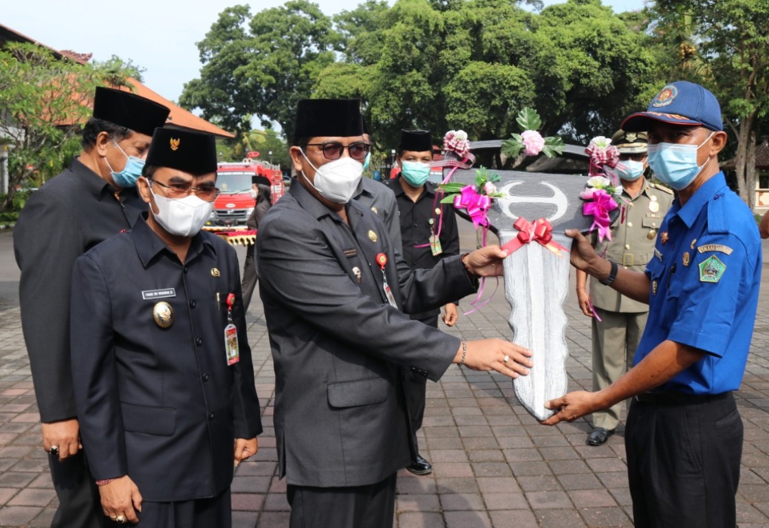Bupati Tabanan Dr. I Komang Gede Sanjaya,SE,MM, disela-sela kegiatan memimpin Apel Gelar Pasukan dalam rangka memperingati HUT Satpol PP sekaligus HUT Satlimas dan Damkar, menyerahkan 2 mobil pemadam kebakaran (Damkar) di halaman depan kantor Bupati Setempat, Senin (8/3).