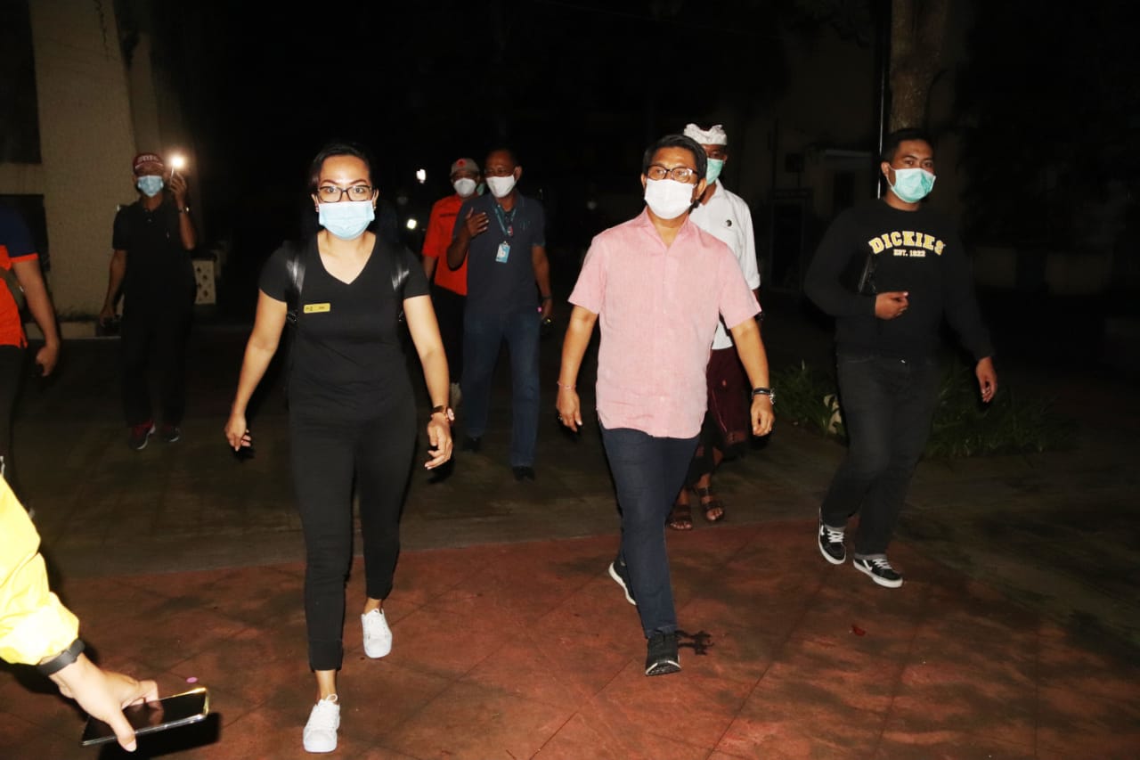 ekretaris Daerah Kabupaten Badung I Wayan Adi Arnawa bersama Tim Satgas Covid-19 termasuk TNI/Polri melakukan pemantauan protokol kesehatan ke sejumlah tempat wisata di wilayah Kuta Selatan, Selasa (29/12) malam. Pemantauan juga diikuti Asisten III Bidang Administrasi Umum yang juga Plt. Kadis Pariwisata Cok Raka Darmawan, Kadis Kesehatan dr. I Nyoman Gunarta, Kasatpol PP IGAK Suryanegara serta dari unsur TNI, Polri, Imigrasi, Satpol PP, BPBD, serta Pecalang.