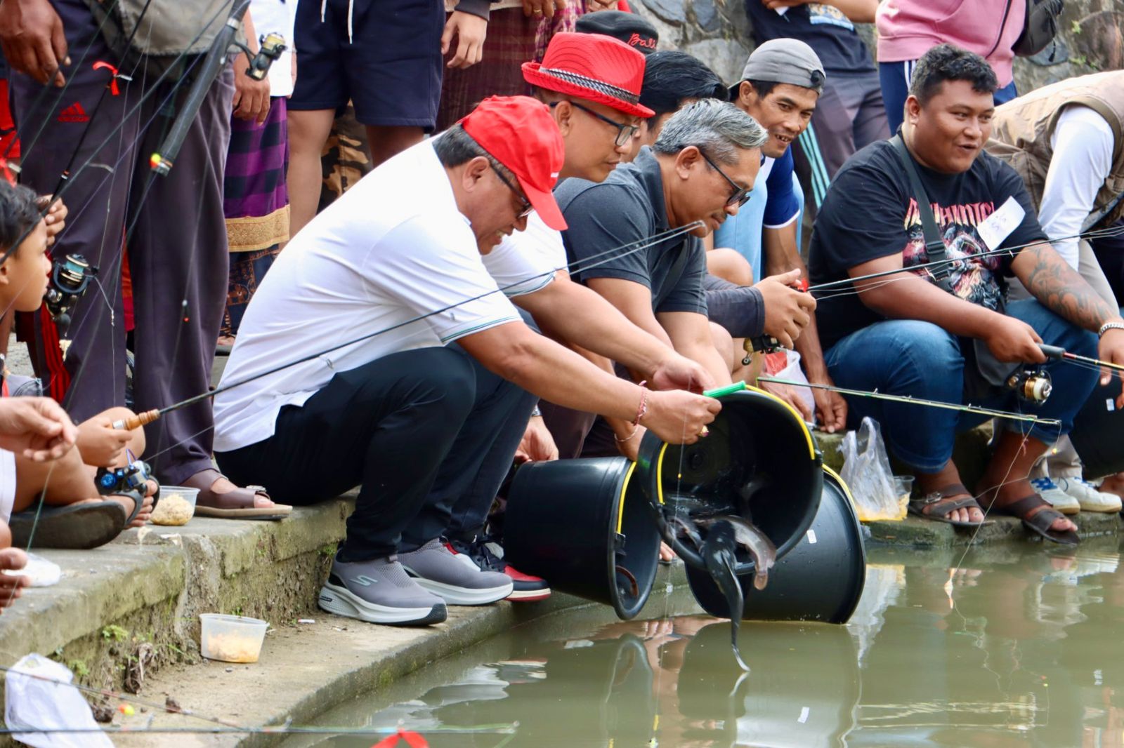 Sekda Kota Denpasar, Ida Bagus Alit Wiradana membuka secara lomba mancing air deras yang diselenggarakan Banjar Binoh Kelod, Denpasar Utara dengan penebaran ikan lele di aliran Tukad (sungai) Tag-Tag Taman Kota Lumintang, Minggu Sore (10/8/2025).