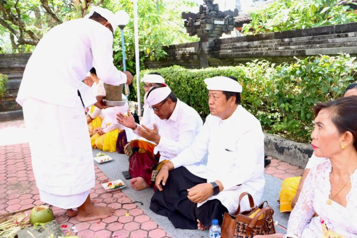 Ket foto : Sekretaris Daerah Kota Denpasar, IB Alit Wiradana menghadiri sekaligus mengikuti prosesi Piodalan Padmasana Kantor PDAM Kota Denpasar, bertepatan dengan rahina Purnama Kapat, Senin (6/10/2025).
