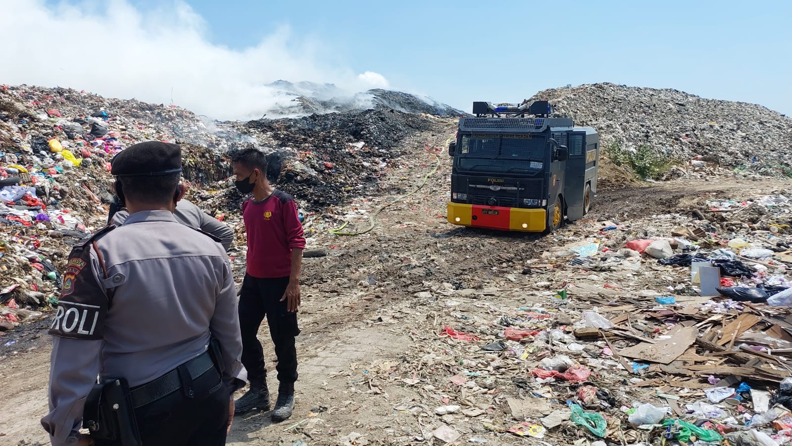 Selain menggunakan heli water bombing milik BNPB untuk mengatasi kebakaran Tempat Pembuangan Akhir Regional Sarbagita (TPA Suwung) di Kelurahan Pedungan, Denpasar Selatan, Polresta Denpasar terpantau mengerahkan satu unit mobil water cannon.
