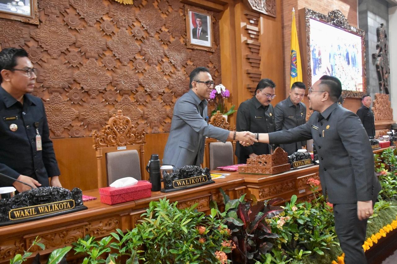 Seluruh Fraksi DPRD Kota Denpasar secara resmi menyetujui penetapan Rancangan Peraturan Daerah (Ranperda) yang diusulkan Pemerintah Kota Denpasar dihadapan Sidang Paripurna DPRD Kota Denpasar yang digelar di Gedung DPRD Kota Denpasar pada Senin (16/6). Ketiga Ranperda yang ditetapkan yakni Rancangan Peraturan Daerah (Ranperda) tentang Pertanggung Jawaban Anggaran Pendapatan dan Belanja Daerah (APBD) Kota Denpasar Tahun Anggaran (TA) 2024, Rancangan Perubahan Kebijakan Umum APBD (Perubahan KUA), serta Rancangan Perubahan Prioritas Plafon Anggaran Sementara (Perubahan PPAS) Kota Denpasar Tahun Anggaran 2025.