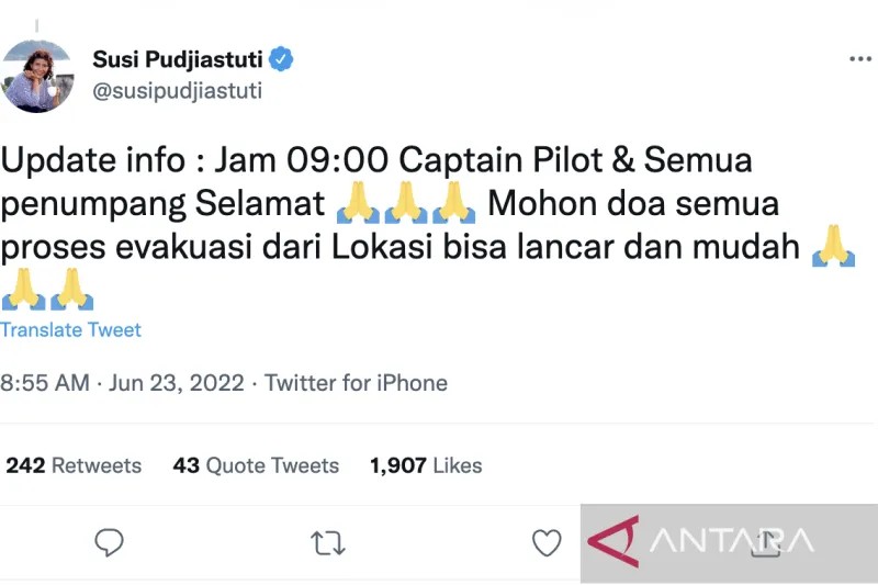 “Update info: Jam 09.00 captain pilot dan semua penumpang selamat,” kata pemilik PT ASI Pudjiastuti Aviation atau penerbangan Susi Air Susi Pudjiastuti melalui cuitan di akun Twitter resminya dengan nama pengguna @susipudjiastuti, dipantau dari Jakarta, Kamis.
