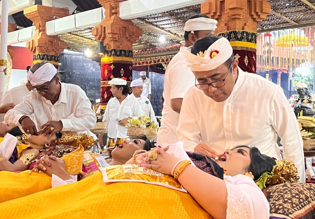 Walikota Denpasar I Gusti Ngurah Jaya Negara Ngayah Nyanggingin serangkaian Karya Metatah dan Atma Wedana (Memukur) Masal yang digelar di Banjar Bun, Desa Dangin Puri, Kecamatan Denpasar Timur, Rabu (12/7) pagi. Karya Metatah dan Memukur masal yang digelar untuk kali keempat ini turut dihadiri Walikota Denpasar periode Tahun 2008-2021, IB Rai Dharmawijaya Mantra.