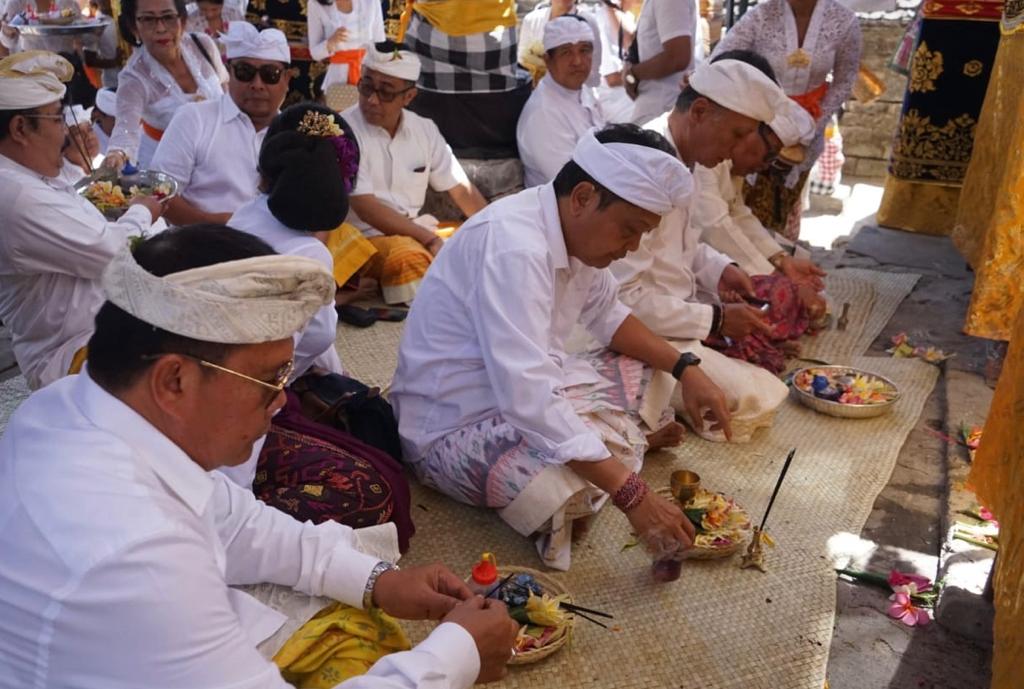 Ket foto ; Suasana Puncak Karya Eka Dasa Warsa Pengratep Pujawali Padudusan Agung di Pura Sakenan Rahina Suci Kuningan, Sabtu (3/8).