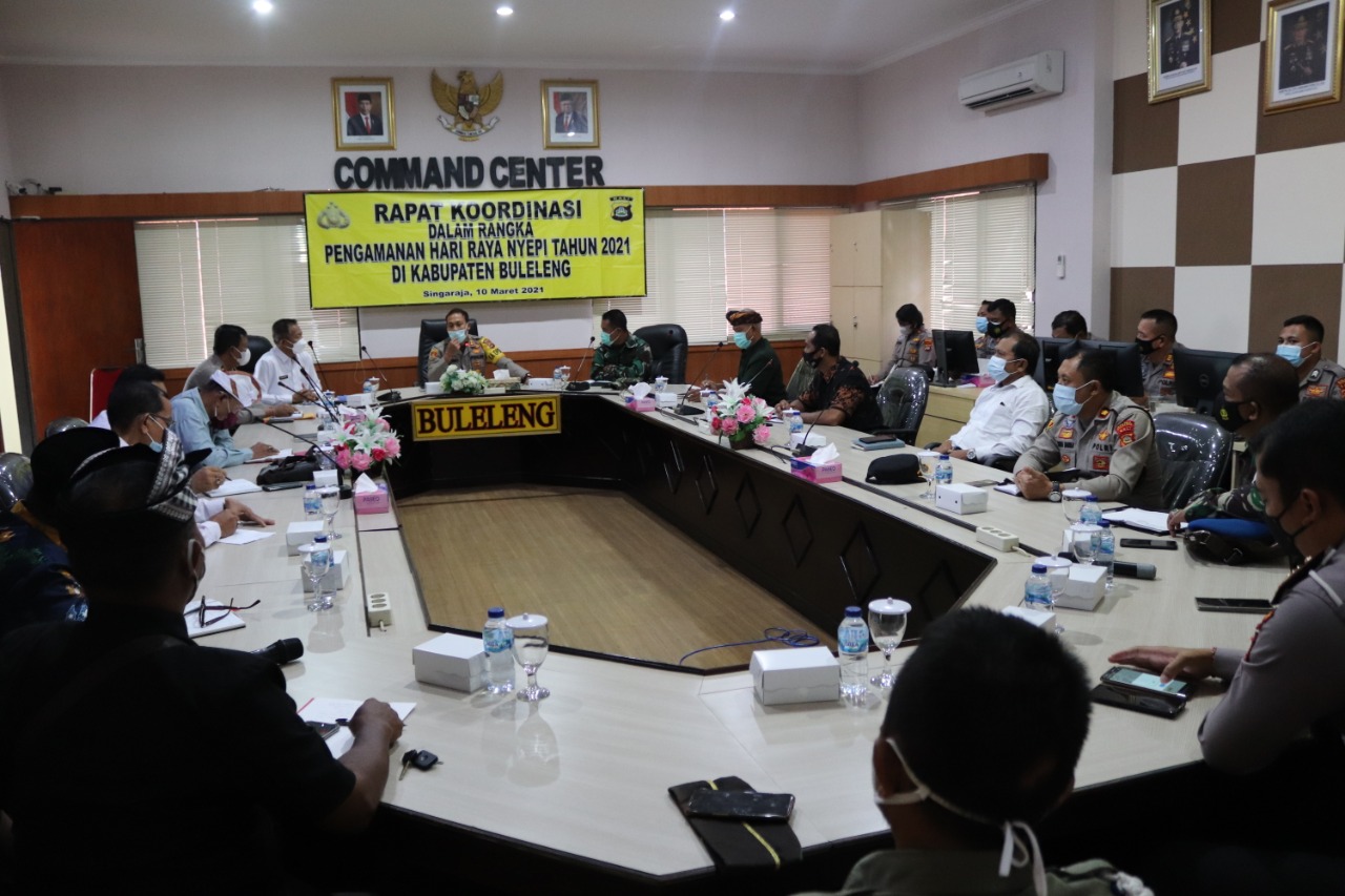 Perayaan hari raya Nyepi Tahun Caka 1943 pada Minggu, 14 Maret 202 di pandemi covid-19, berbeda dengan perayaan Nyepi tahun-tahun sebelumnya yang hingar bingar dengan kegiatan atraksi Ogoh-Ogoh maupun kegiatan lainnya. Terhadap hal ini, dilaksanakan Rapat Kordinasi (Rakor) di Polres Buleleng pada Rabu, (10/3/2021). Rakor dipimpin langsung Kapolres Buleleng AKBP I Made Sinar Subawa, S.I.K.,M.H., yang didampingi Pejabat Utama dan Kapolsek Jajaran Polres Buleleng.