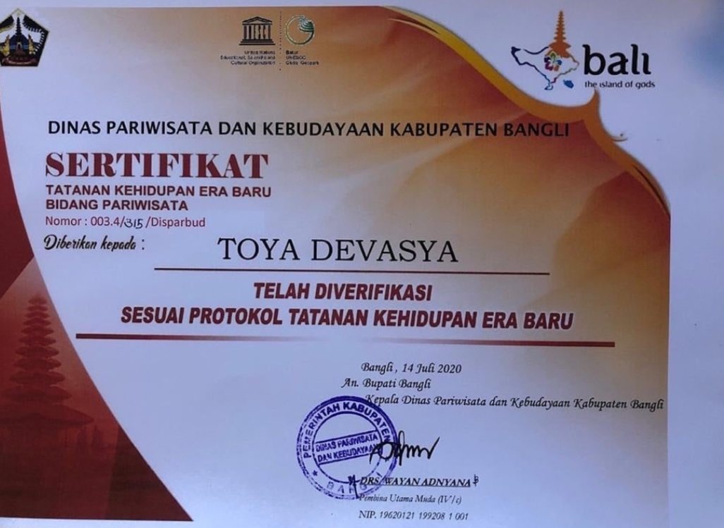 Manajemen Toya Devasya Hot Spring Waterpark juga mengingatkan kembali akan pentingnya penerapan protokol kesehatan pencegahan Covid-19 yang dikenal sebagai konsep Cleanliness (Bersih), Healthy (Sehat), dan Safety (aman). Sebagai informasi Toya Devasya menjadi tempat wisata yang pertama di kabupaten Bangli yang dikunjungi dan dicek oleh tim gugus tugas pencegahan Covid-19 kabupaten Bangli dalam penerapan protokol kesehatan. Tim gugus tugas keamanan pencegahan Covid-19 kab. Bangli tersebut dipimpin oleh Kapolres Bangli, Dandim Bangli serta dihadiri unsur petugas kesehatan dan Satpol PP. Tim Verifikator dari dinas pariwisata kabupaten Bangli yang melakukan sertifikasi penerapan protokol kesehatan tatanan kehidupan baru (New Normal) juga menjadikan Toya Devasya sebagai pilot project pertama di kabupaten Bangli. Toya Devasya Hot Spring Waterpark juga menjadi destinasi wisata pertama di kabupaten Bangli yang mendapatkan sertfikat protokol tatanan kehidupan baru bidang pariwisata. Bahkan tim verifikator menyatakan akan menjadikan SOP protokol kesehatan pencegahan Covid-19 Toya Devasya sebagai contoh bagi penerapan protokol tatanan kehidupan baru bidang pariwisata di kabupaten Bangli.