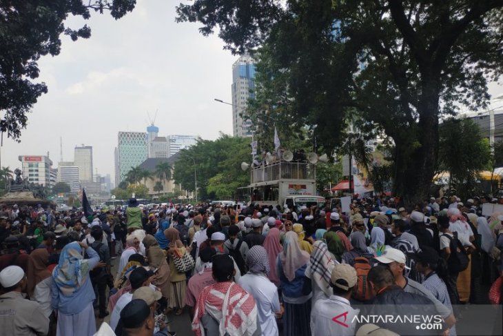 Sejumlah massa berkumpul di kawasan Patung Kuda Monas menggelar aksi halal bihalal, tahlil akbar serta mengawal sidang MK, di Jakarta, Rabu, (26/06/2019). ANTARA/Boyke Ledy Watra/aa