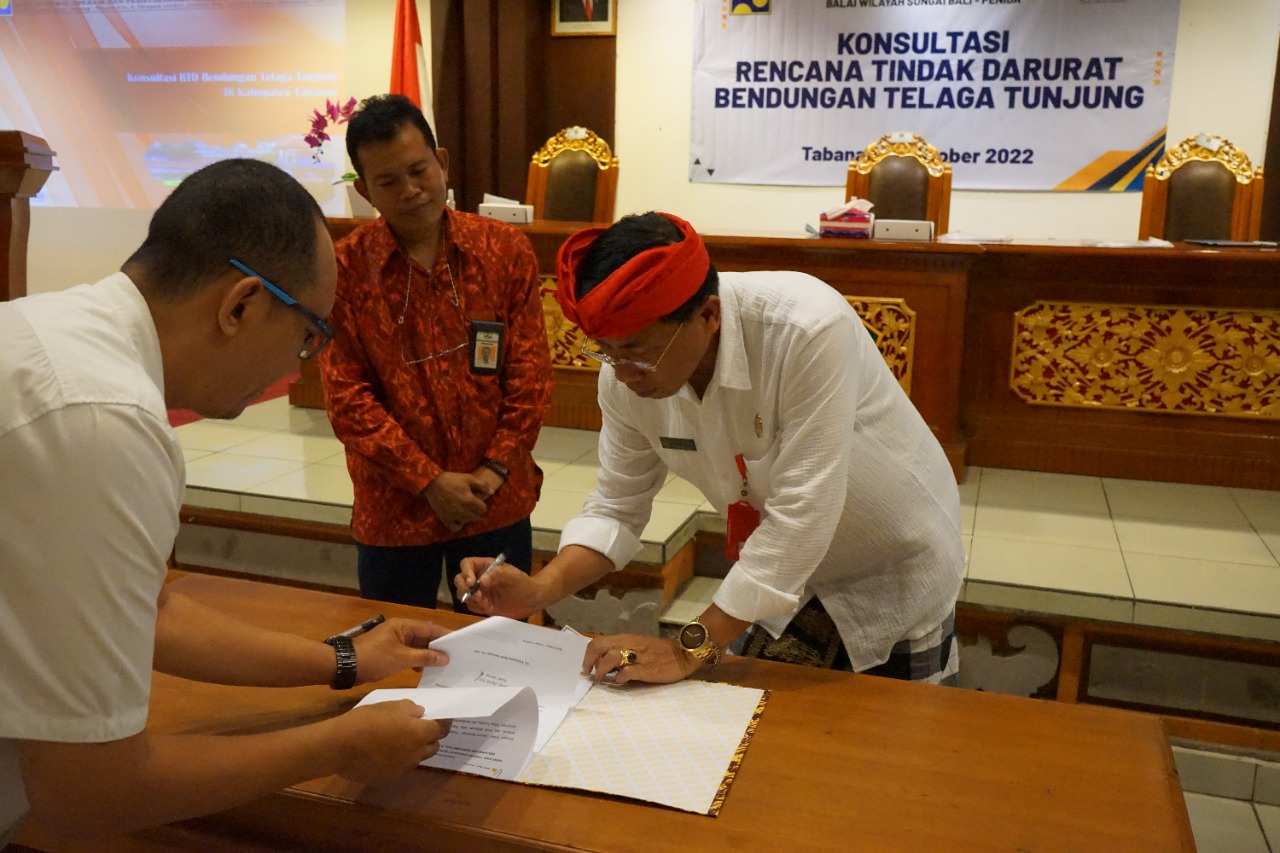 Penandatanganan ini dilakukan antara Bupati Tabanan, Dr. I Komang Gede Sanjaya, S.E.,M.M yang kehadiraanya saat itu diwakili oleh Sekda Susila, dengan Kepala Balai Wilayah Sungai Bali-Penida, Dr. Eka Nugraha Abdi, ST.,M.P.P.M yang saat itu juga diwakili oleh I Ketut Alit Sudiastika, ST.,M.Si. Kegiatan bertemakan Konsultasi RTD Bendungan Telaga Tunjung di Kabupaten Tabanan tersebut, juga dihadiri oleh Forkopimda Tabanan dan Kepala Dinas PUPRPKP Kabupaten Tabanan, serta para OPD terkait.