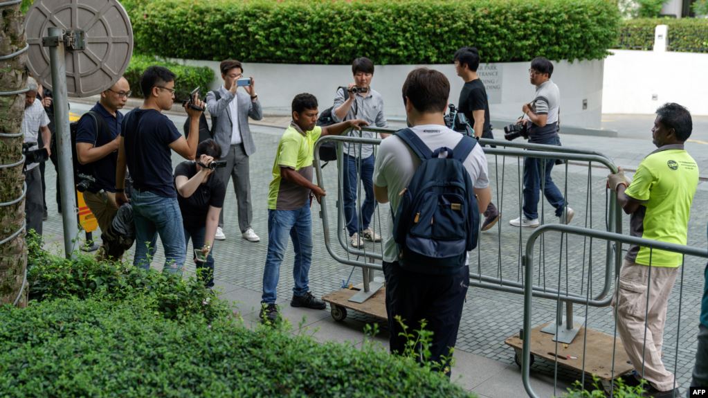 Para wartawan yang bersiap meliput pertemuan pemimpin Korea Utara Kim Jong un dan Presiden AS Donald Trump di luar Hotel Fullerton, Singapura, 31 Mei 2018.
