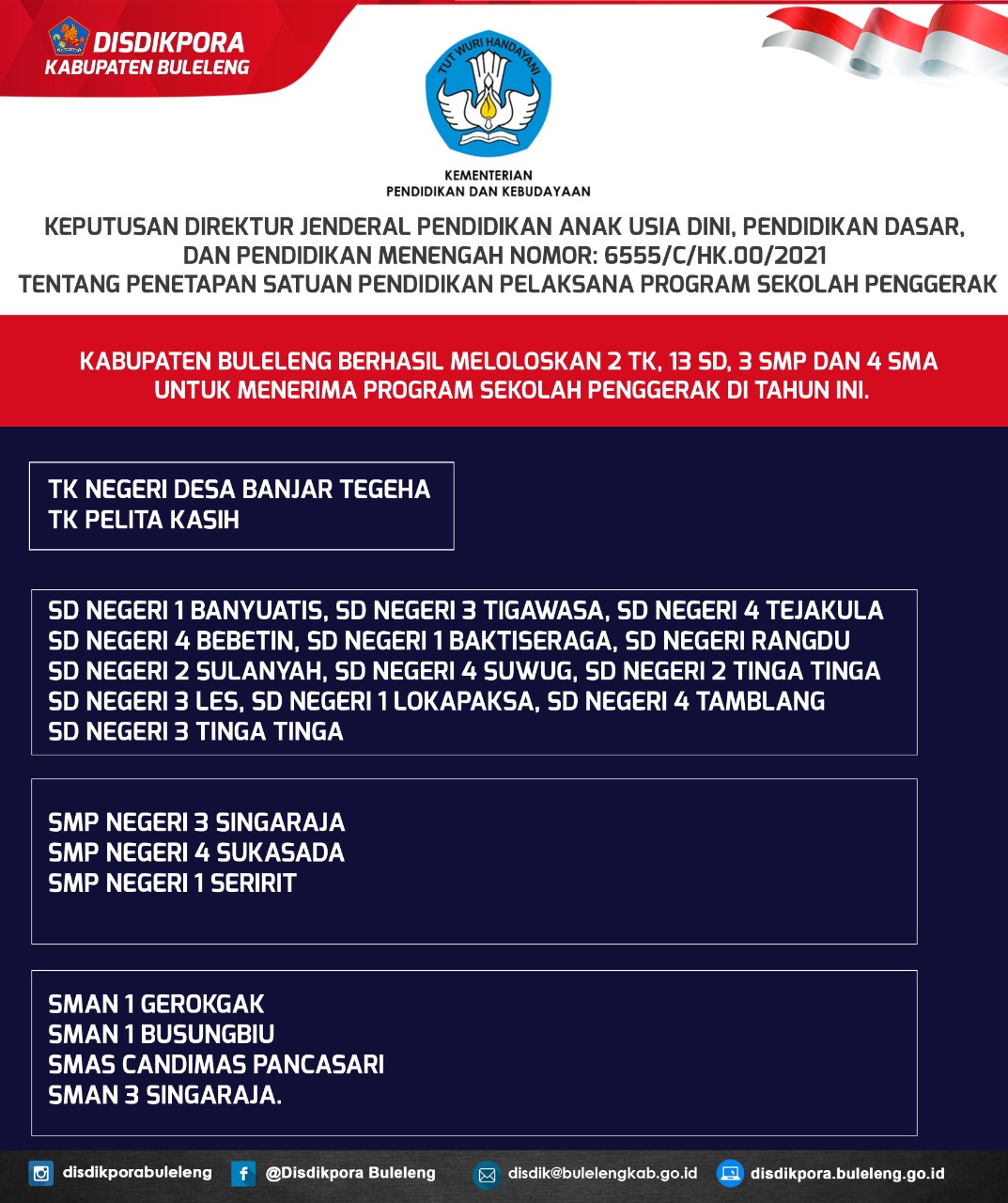 Adapun Satuan Pendidikan yang ditetapkan penerima Program Sekolah Penggerak adalah TK NEGERI DESA BANJAR TEGEHA, TK PELITA KASIH, SD NEGERI 1 BANYUATIS, SD NEGERI 3 TIGAWASA, SD NEGERI 4 TEJAKULA, SD NEGERI 4 BEBETIN, SD NEGERI 1 BAKTISERAGA, SD NEGERI RANGDU, SD NEGERI 2 SULANYAH, SD NEGERI 4 SUWUG, SD NEGERI 2 TINGA TINGA, SD NEGERI 3 LES, SD NEGERI 1 LOKAPAKSA, SD NEGERI 4 TAMBLANG, SD NEGERI 3 TINGA TINGA, SMP NEGERI 3 SINGARAJA, SMP NEGERI 4 SUKASADA, SMP NEGERI 1 SERIRIT, SMAN 1 GEROKGAK, SMAN 1 BUSUNGBIU, SMAS CANDIMAS PANCASARI dan SMAN 3 SINGARAJA. (dra)