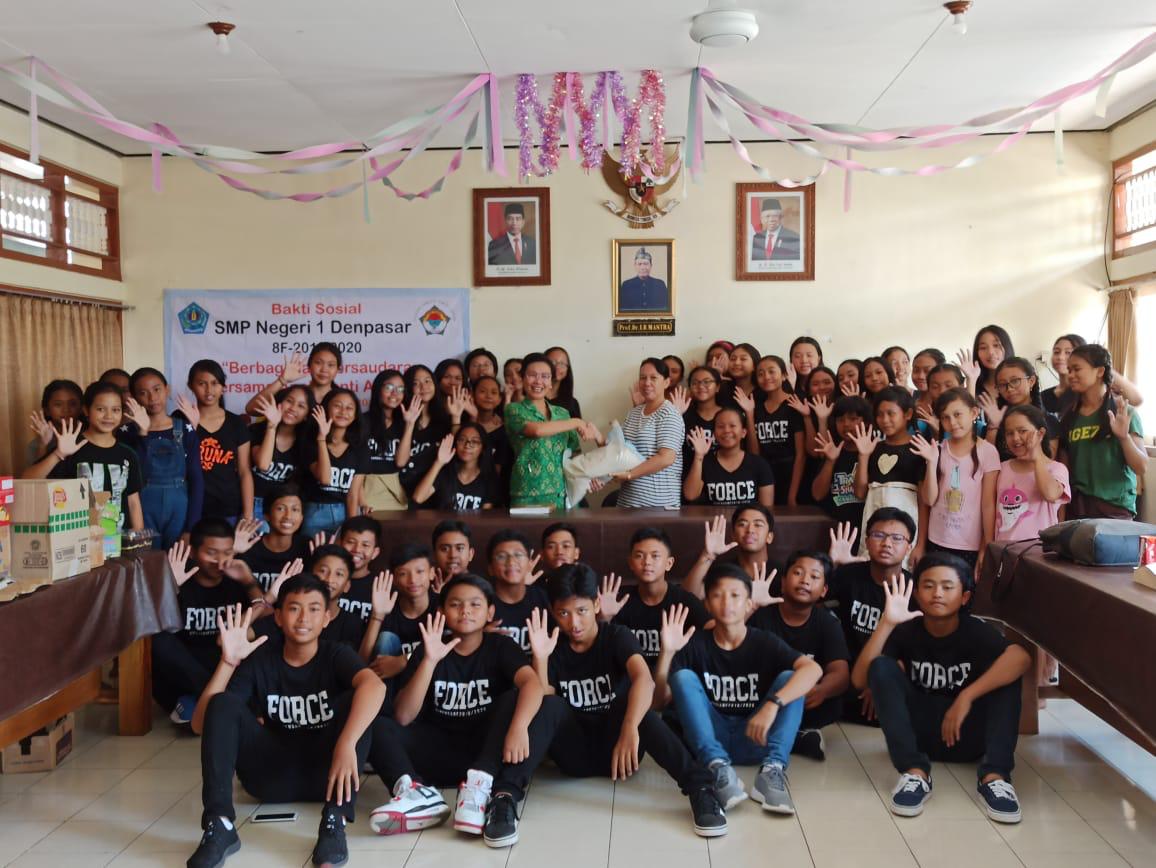Pada kesempatan itu, siswa-siswi kelas 8F memberikan bantuan sembako, serta makanan dan minuman. Anak-anak panti asuhan juga dihibur dengan pertujukan seni oleh siswa-siswi kelas 8F SMPN 1 Denpasar.