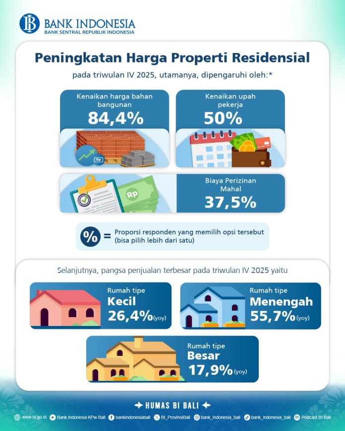 “Data tersebut menunjukkan bahwa permintaan dan penyesuaian harga terjadi secara merata di semua segmen pasar, mulai dari hunian sederhana hingga rumah berukuran besar,” ungkap Kepala Bank Indonesia (BI) Perwakilan Provinsi Bali, R. Erwin Soeriadimadja di Denpasar, Rabu (25/2/2026).