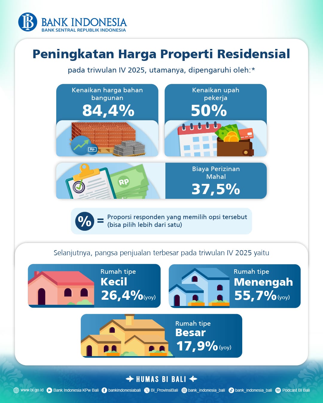 Mayoritas responden dalam survei menyebutkan bahwa: harga bahan bangunan yang terus naik, dan peningkatan upah tenaga kerja, menjadi faktor utama yang mendorong kenaikan harga jual rumah di pasar primer Bali.
