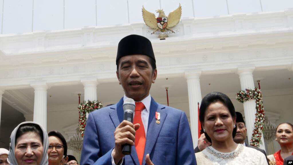Presiden Joko Widodo (tengah) memberikan keterangan kepada wartawan di Istana Merdeka, Jakarta, 23 Oktober 2019. (Foto: dok).