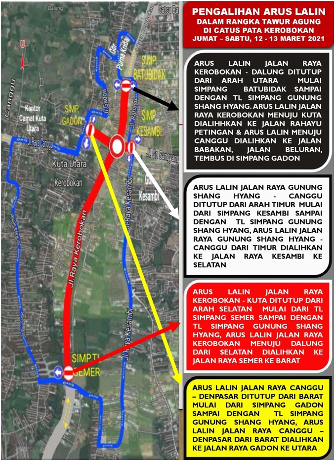 Pengalihan Arus Lalin dalam rangka Tawur Agung di Catus Pata Kerobokan, Jumat – Sabtu (12-13) Maret 2021.