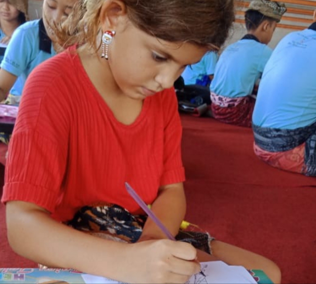 Terkait turis Mira Bella, diakui sudah bergabung ikut latihan melukis style Batuan sejak 2 bulan terakhir. “Dia rutin ikut setiap hari Minggu. Begitu dia dengar ada lomba, dia paling antusias bilang ikut,” ungkapnya.