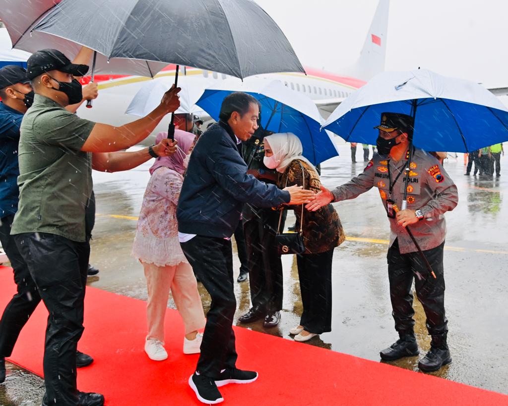 Presiden Joko Widodo dan Ibu Iriana Joko Widodo tiba di Pangkalan Udara Utama Angkatan Darat Ahmad Yani, Kota Semarang, Provinsi Jawa Tengah, pada Sabtu, 25 Februari 2023, sekitar pukul 08.40 WIB. Hujan deras dengan angin kencang sambut ketibaan Presiden Jokowi dan Ibu Iriana pagi ini.