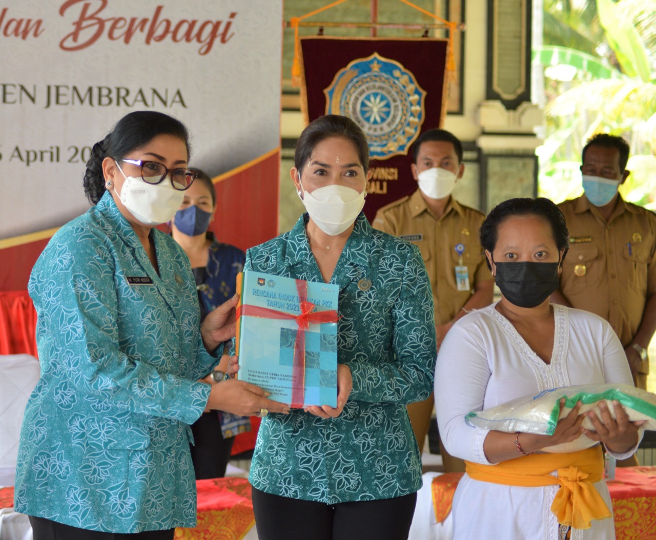 Ketua Tim Penggerak (TP) PKK Provinsi Bali Putri Koster didampingi Ketua TP PKK Kabupaten Jembrana Candrawati Tamba dan Ketua Gerakan Organisasi Wanita (GOW) Jembrana Inda Patriana Krisna melaksanakan aksi sosial berbagi dan berbakti di Kabupaten Jembrana yang dipusatkan di Wantilan Pura Puseh Desa Gumbrih, Senin (25/4).