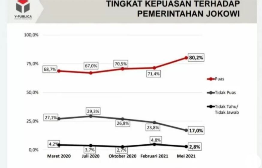 Hasil survei yang dilakukan oleh Y-Publica menunjukkan tingkat kepuasan publik terhadap kinerja pemerintahan Jokowi-Ma’ruf mencapai 80,2 persen.