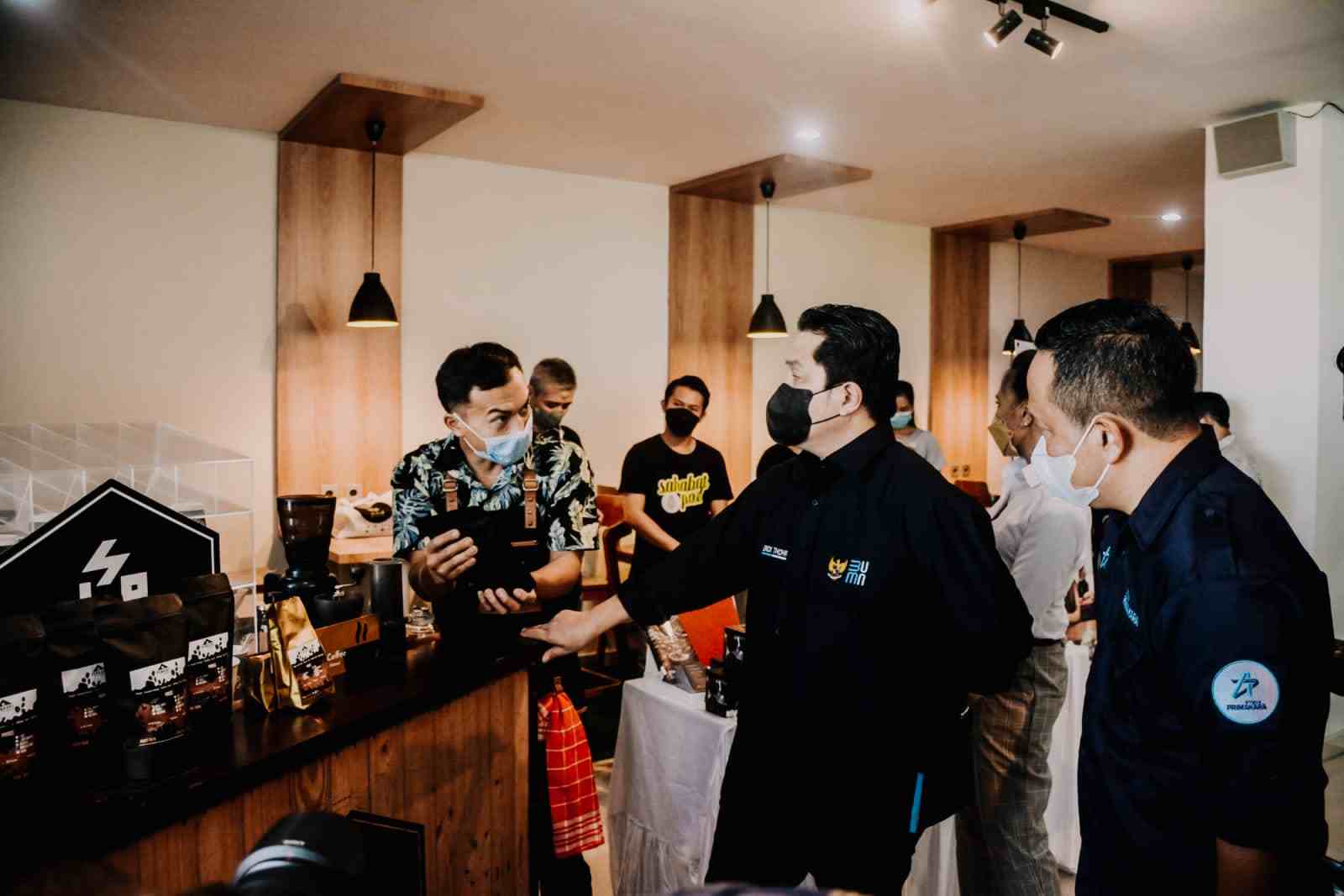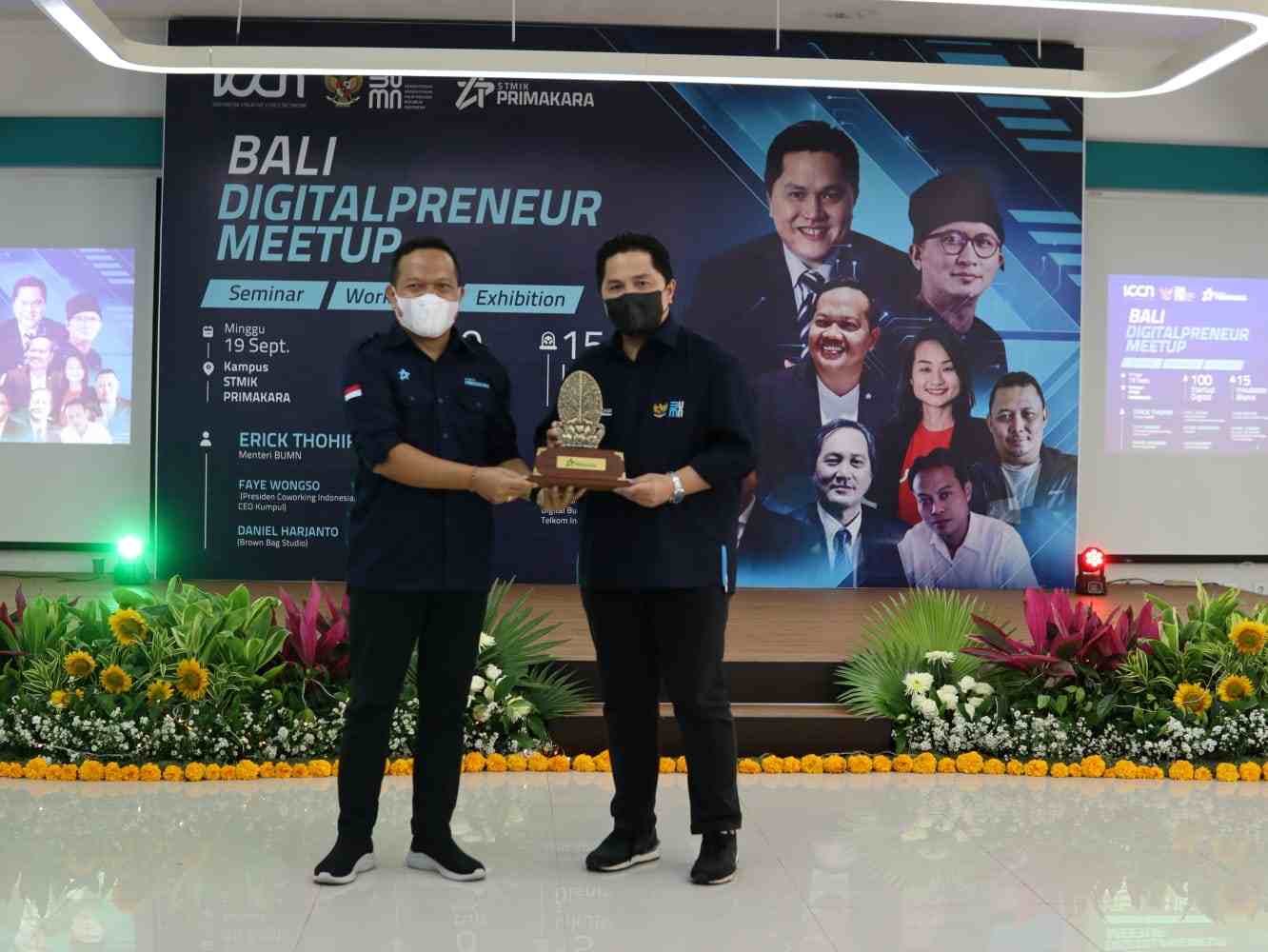 Foto: Menteri BUMN Erick Thohir didampingi Ketua STMIK Primakara Made Artana meninjau produk startup di sela-sela acara “Bali Digitalpreneur Meetup” di kampus STMIK Primakara, Denpasar, Minggu sore (19/9/2021).