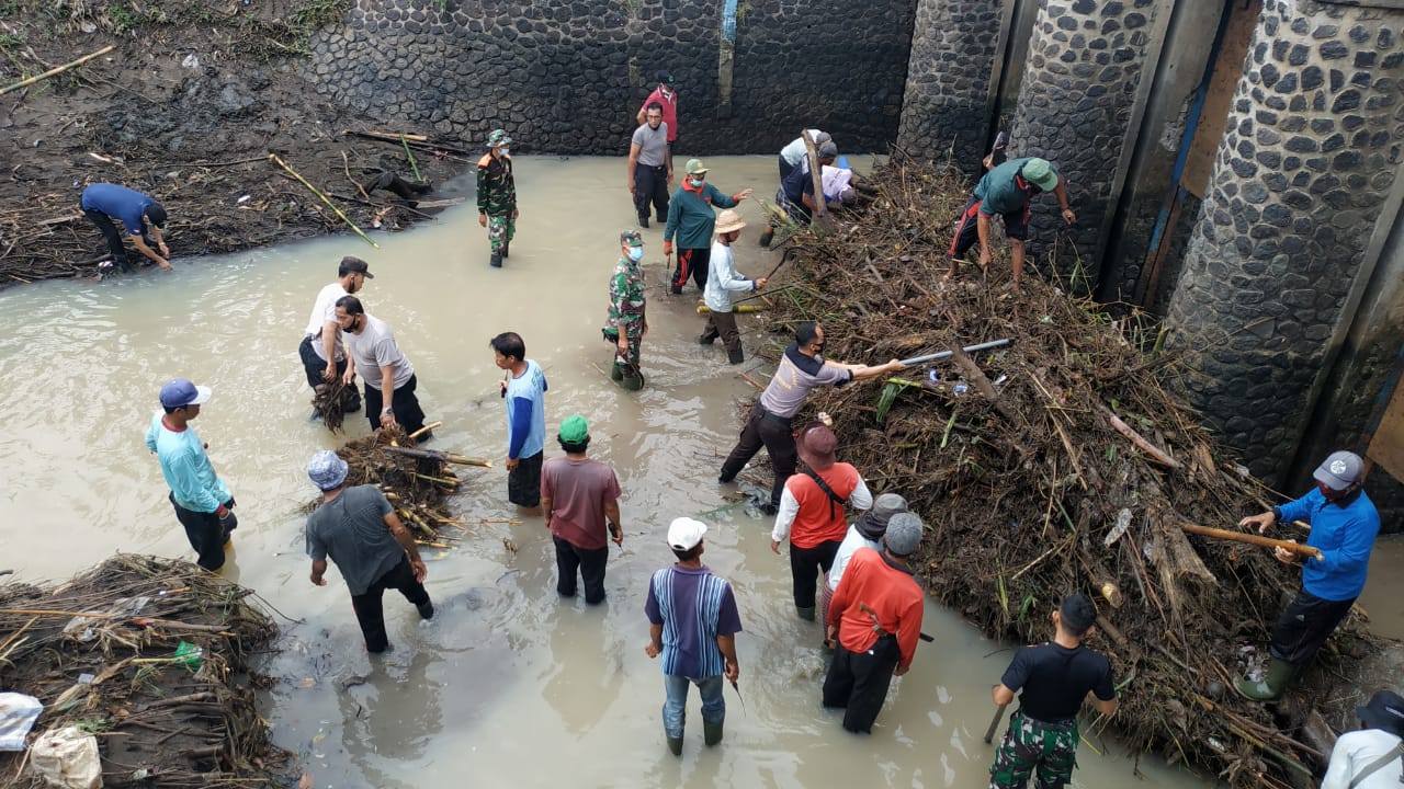 TNI dan Polri bersama warga bergotong royong membersihkan sampah di Bendung Kaliakah, Desa Kaliakah, Kecamatan Negara, Kamis (23/9/2021) pagi.