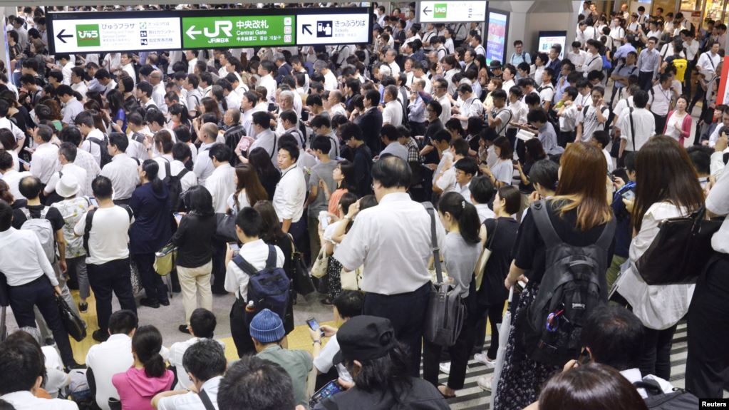 Kerumunan penumpang di stasiun Urawa, di Saitama, utara Tokyo, yang menunggu layanan kereta kembali normal setelah dihentikan sementara akibat Badai Faxai, di Tokyo, 9 September 2019. (Foto: Reuters)