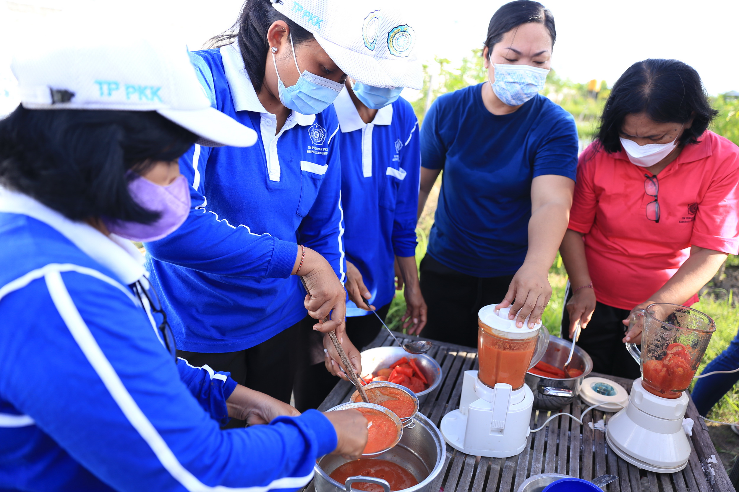 TP PKK Klungkung memantapkan dan mematangkan pelatihan saus tomat dan saus cabai di Kebun Hatinya PKK Klungkung TOSS Center Karangdadi, Kusamba, Jumat (17/12/2021.
