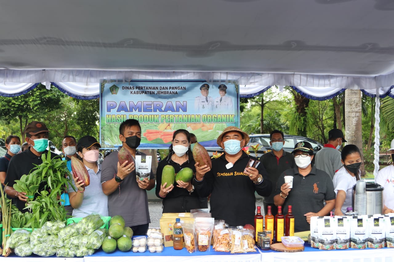 Selain melaksanakan kegiatan resik sampah plastik, Bupati Tamba bersama Wabup Patriana Krisna dan Anggota Forkopimda yang hadir, juga meninjau langsung stand hasil produk pertanian organik di halaman Gedung Kesenian Dr. Ir. Soekarno.